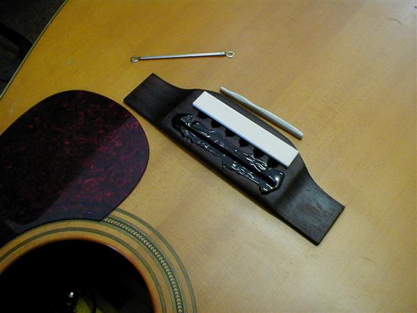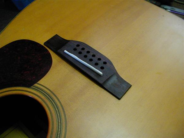 In this instance, the customer wanted an LR Baggs pickup fitted, so the saddle slot needed to be lengthened as well. The guitar was also beginning to show signs of collapse so the worst case scenario was a neck reset. We went for the best case and shaved a mm from the top of the bridge.