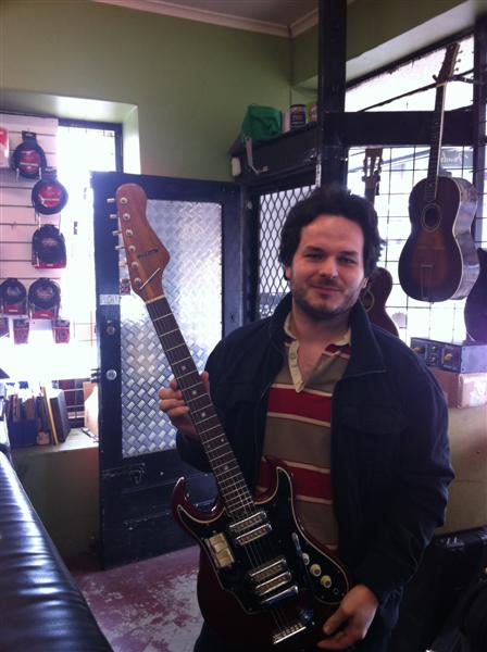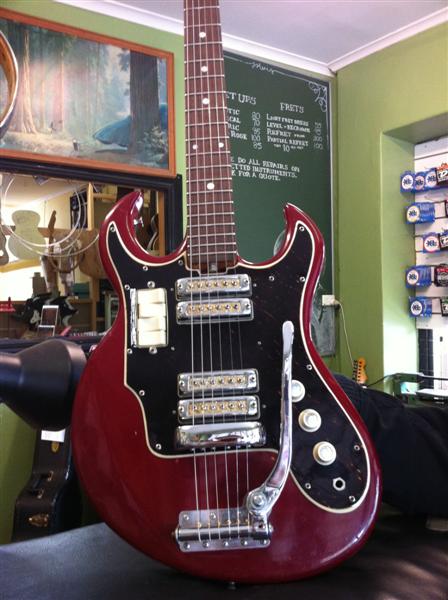 Manufactured by Ibanez or Teisco in the early '60s, this garage rock hot rod came in with a severely concave neck.