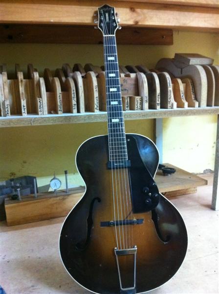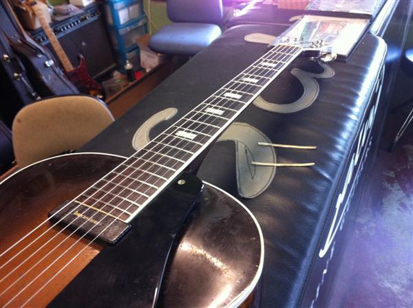This guitar, a 1954 Epiphone, came in for new neck binding. You can see some of the old stuff on the bench.